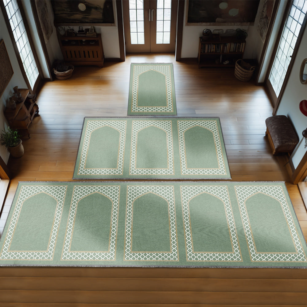 Modern Müslüman Yaşamının zarafetini yansıtan bu özel yumuşak seccade, geleneksel İslami motifleri çağdaş bir tasarımla buluşturmak için özenle tasarlandı.